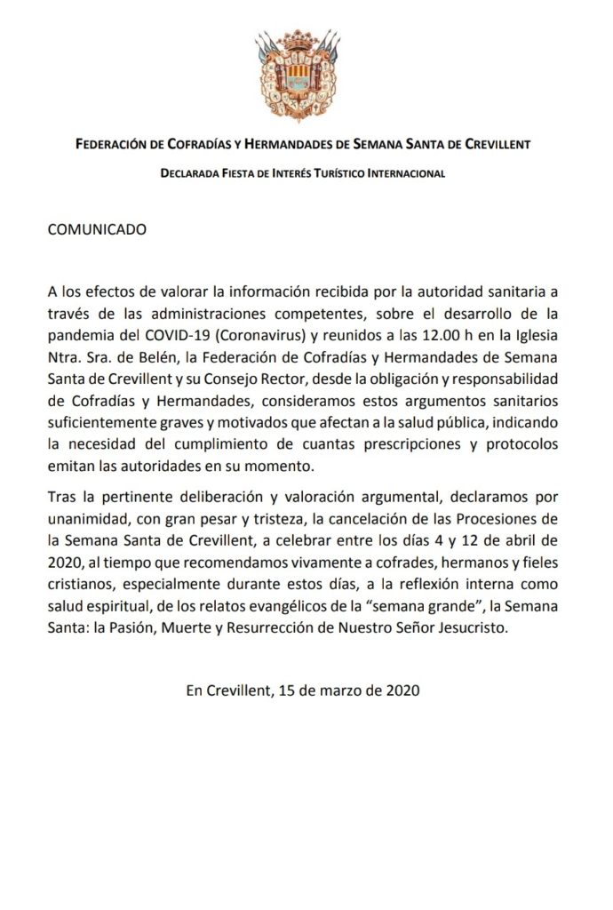 “Tras la pertinente deliberación y valoración argumental, declaramos por unanimidad, con gran pesar y tristeza, la cancelación de las Procesiones de la Semana Santa de Crevillent, a celebrar entre los días 4 y 12 de abril de 2020, al tiempo que recomendamos vivamente a cofrades, hermanos y fieles cristianos, especialmente durante estos días, a la reflexión interna como salud espiritual, de los relatos evangélicos de la “semana grande”, la Semana Santa: la Pasión, Muerte y Resurrección de Nuestro Señor Jesucristo”.