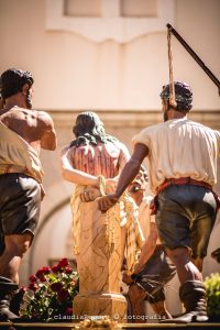 El grupo escultórico, realizado por Riudavets en 1867, representa el momento en que Jesús atado es azotado por tres sayones. Jesús se encuentra maniatado a una columna hexagonal. Los brazos los tiene entrecruzados pero sin llegar a estar apoyados sobre la columna. El paso se estructura de forma cuadrangular, teniendo como eje central la figura de Jesús atado a la columna, rodeado por las figuras de los sayones, distribuidas dos detrás azotándole y una delante en señal burlesca hacia Jesús.