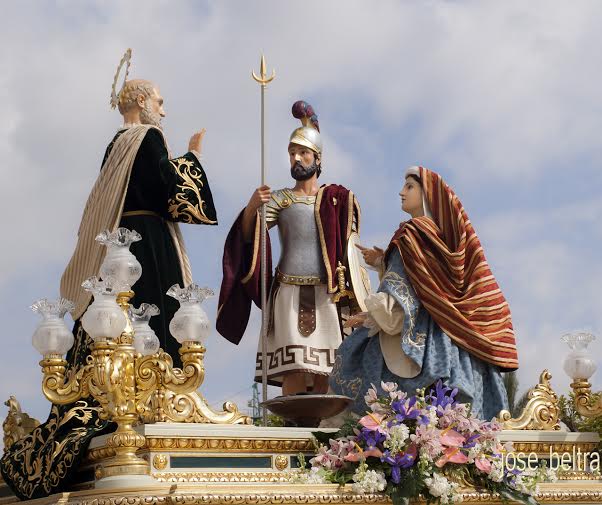 El grupo escultórico consta de tres figuras: un armado o romano, una mujer y San Pedro a quienes les acompaña un gallo disecado que, muy gentilmente, dona el taxidermista local D. Manuel Más.
