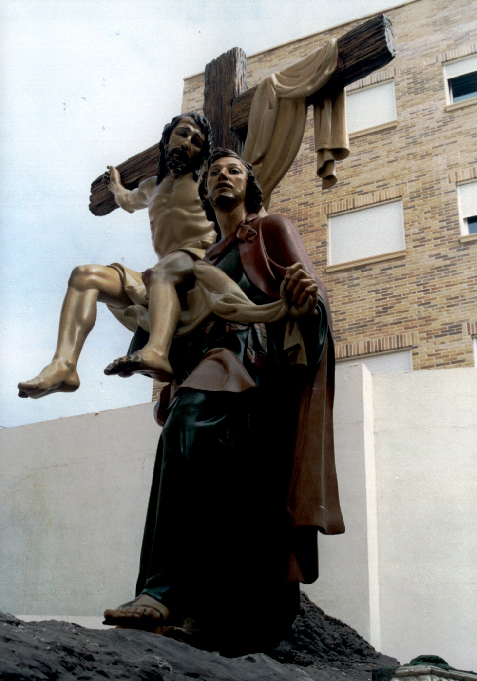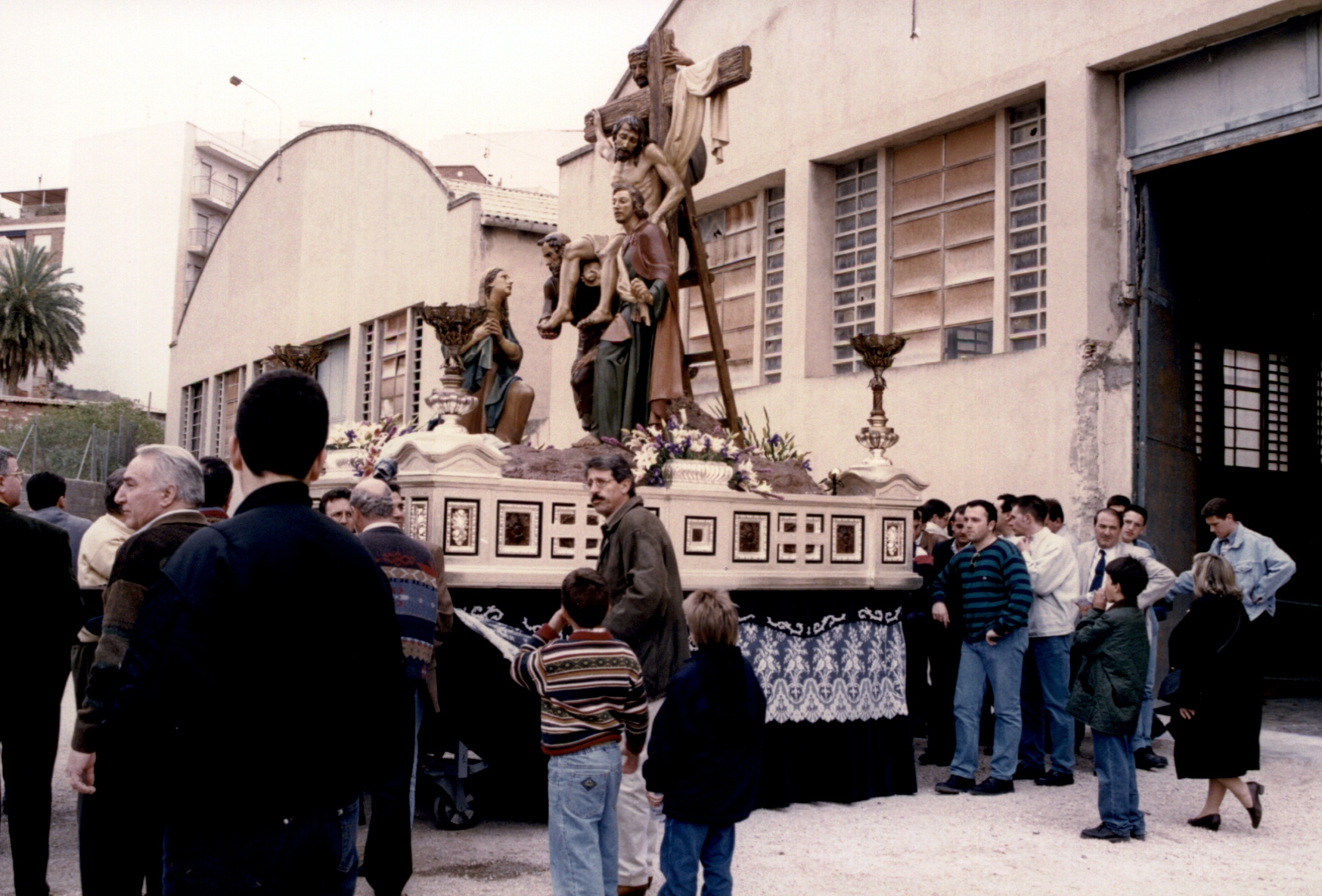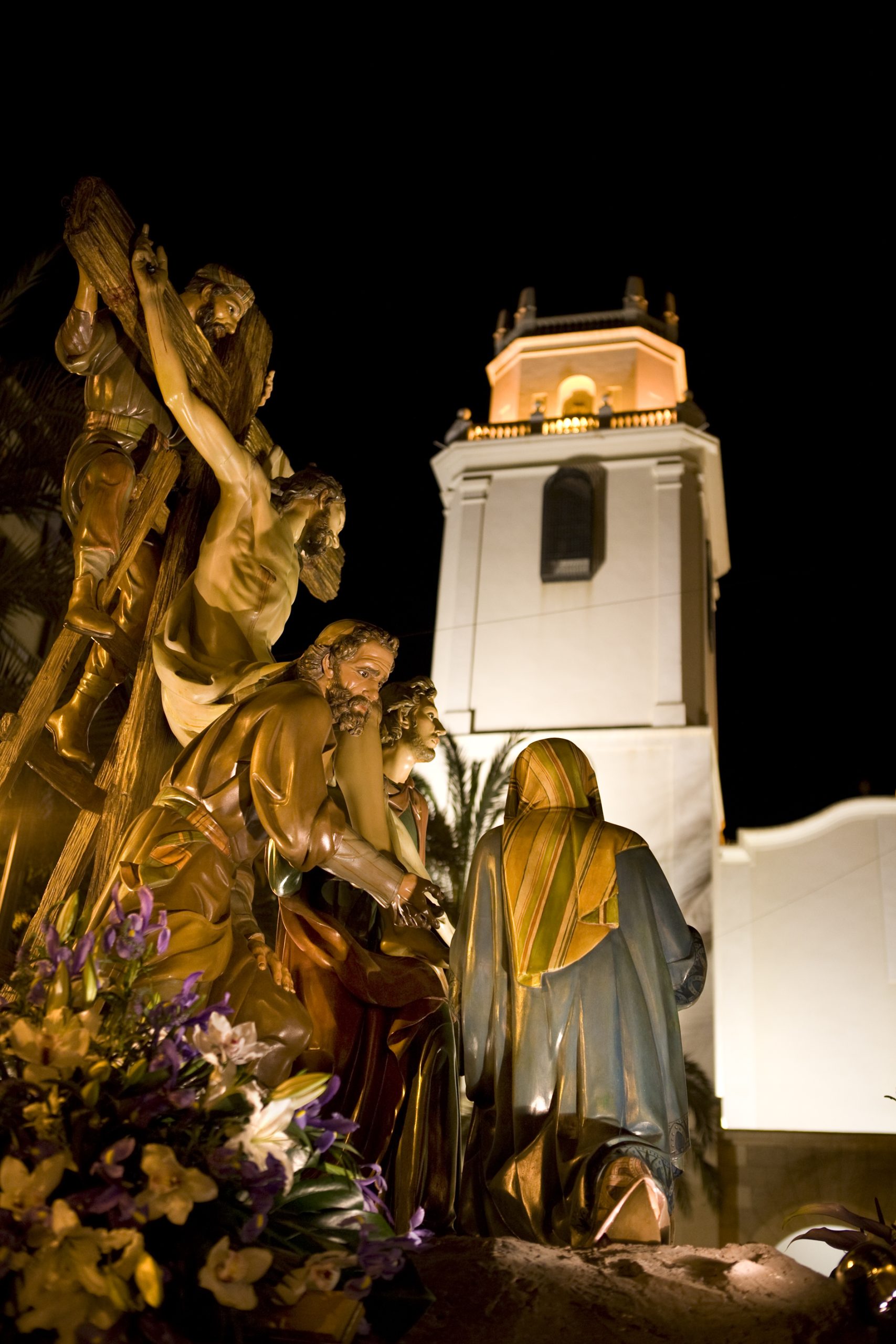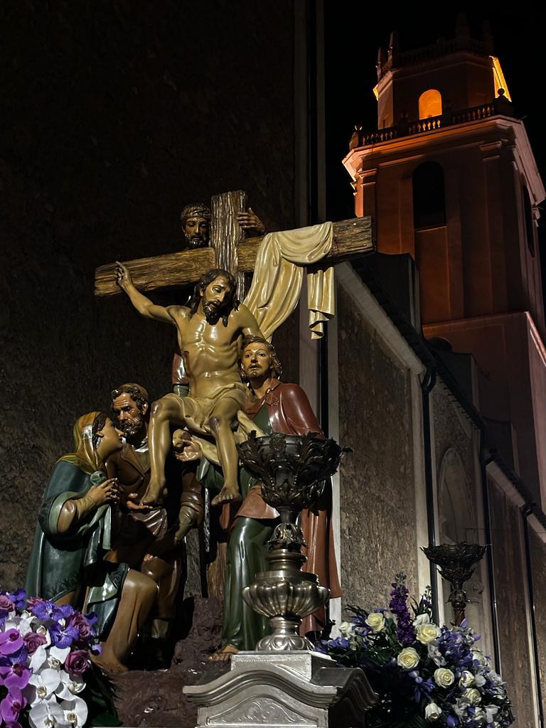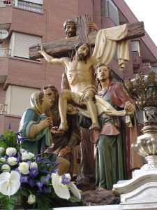 IMAGEN O GRUPO TITULAR: Cristo en el momento de ser desclavado de la Cruz, Nicodemo encaramado a la escalera, José de Arimatea y San Juan sujetando el cuerpo de Cristo y la Virgen María. Como dato, las imágenes fueron restauradas por Asoarte (Murcia) en 2002.