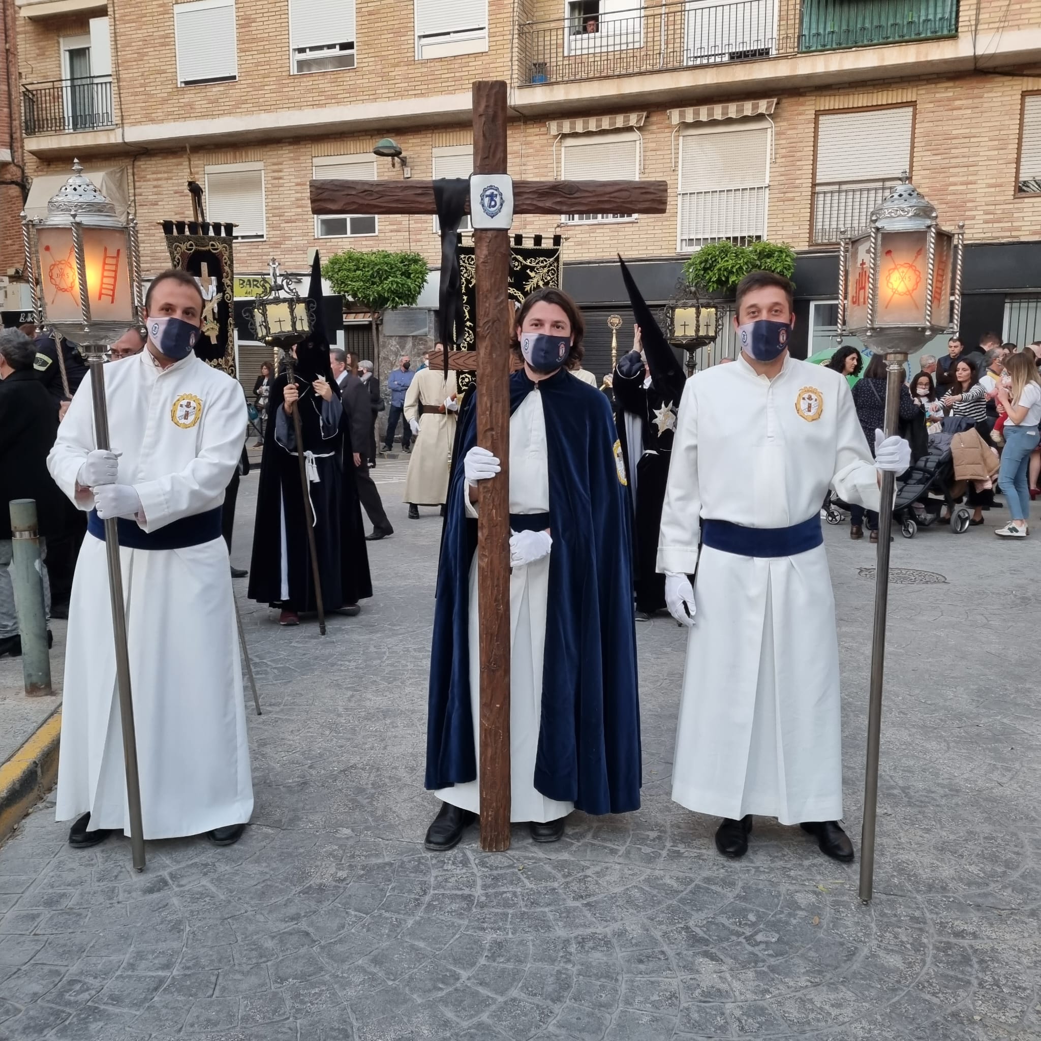 COLORES DE LA COFRADÍA/VESTA: Túnica color hueso, Fajín de terciopelo azul marino, capirote color hueso y capa de terciopelo azul marino con el escudo bordado.