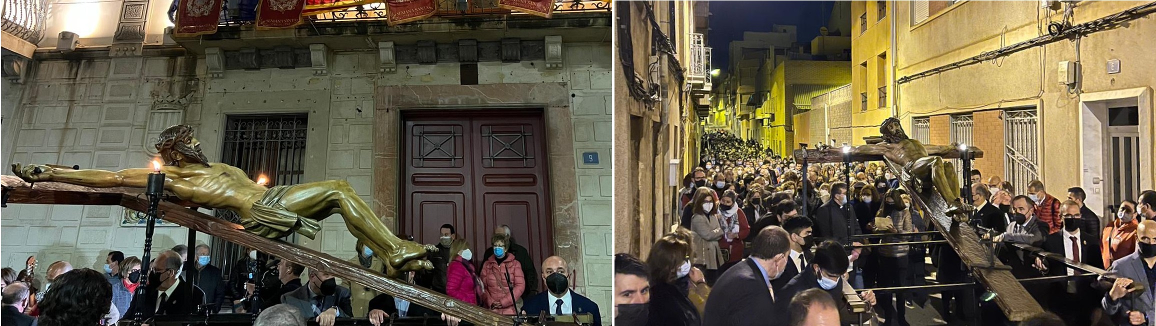 The people of Crevillent participate massively in the Liturgical Offices of the Last Supper of the Lord and later accompany the Christ of Forgiveness and the Good Death in his walk to the Calvary praying the fourteen stations of the Stations of the Cross.