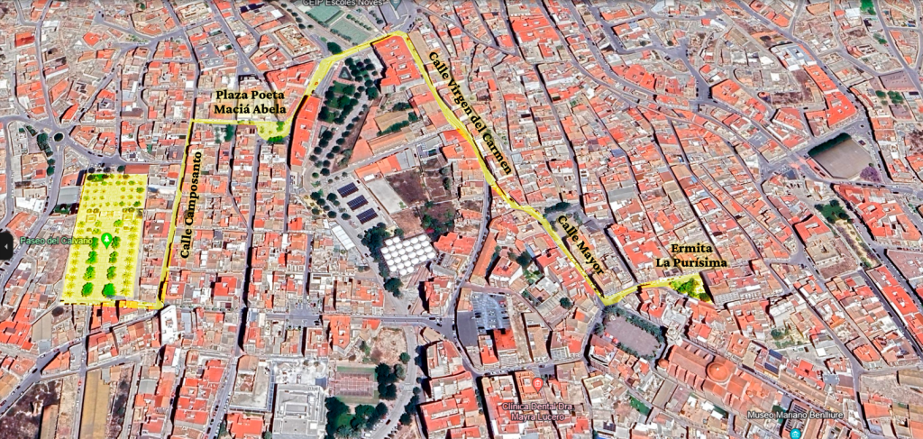 Itinerario: Ermita de La Purísima – Calle Mayor – Calle Llavador – Puente Jorge Juan – Calle Ribera – Plaza Maciá Abela – Calle Camposanto – Calle San Sebastián – Paseo del Calvario .