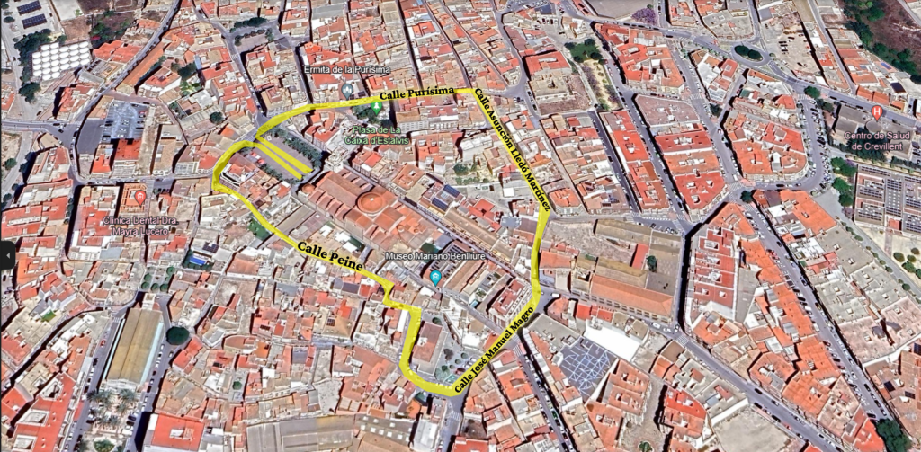 Itinerario: Plaza Constitución – Calle Blasco Ibáñez – La Morquera – Calle San Sebastián – Plaza Chapí – Calle Santísima Trinidad – Plaza Maciá Abela.
